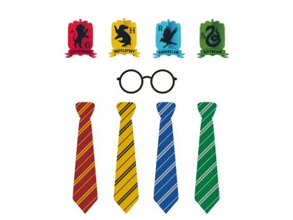 - Papírové rekvizity s držáčkem v s motivem Moudrého klobouku, Zlatonky, Bezové hůlky, Harryho brýlí a zvířat Bradavických kolejí